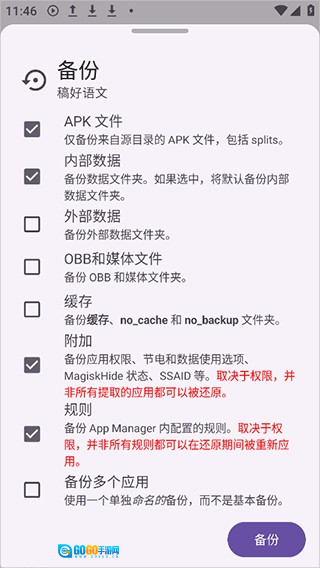 2、借助备份向导挑选加密方式,推荐采用ECC混合加密来保护应用数据,设定密码后对包含权限配置等在内的所有信息进行完整备份。