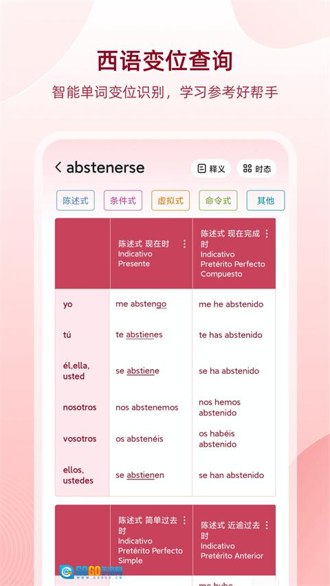 6. 西班牙语动词变位反向查询服务,可查询17种时态的动词变位。
