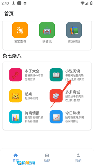 1、进入坨子大队后,打开首页,便能挑选所需的工具服务,例如在此处选择看小说。