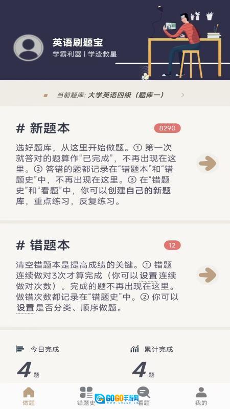 1. 从新题库里挑选题目,在此处开启练习。首次尝试就回答正确的题目,会被判定为“完成”,后续不会再在此处出现。而所有答错的题目,都会记录到“错误记录簿”以及“错误记录”当中,同样不会再出现在这里。