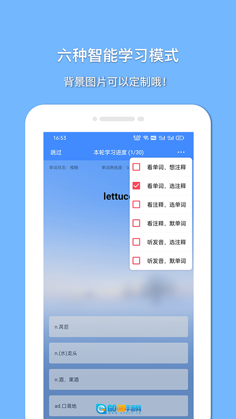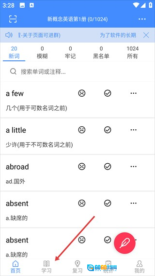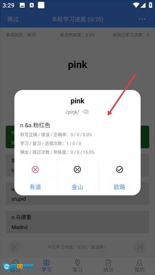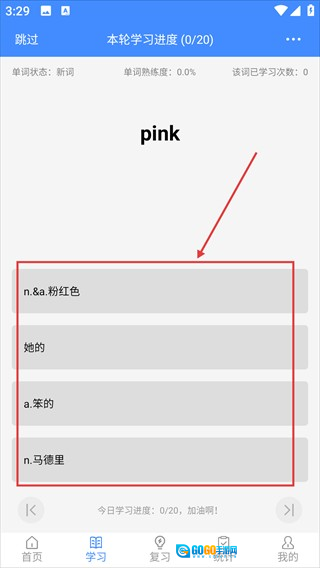 2. 在学习界面,就当下所展示的单词,挑选正确的释义。