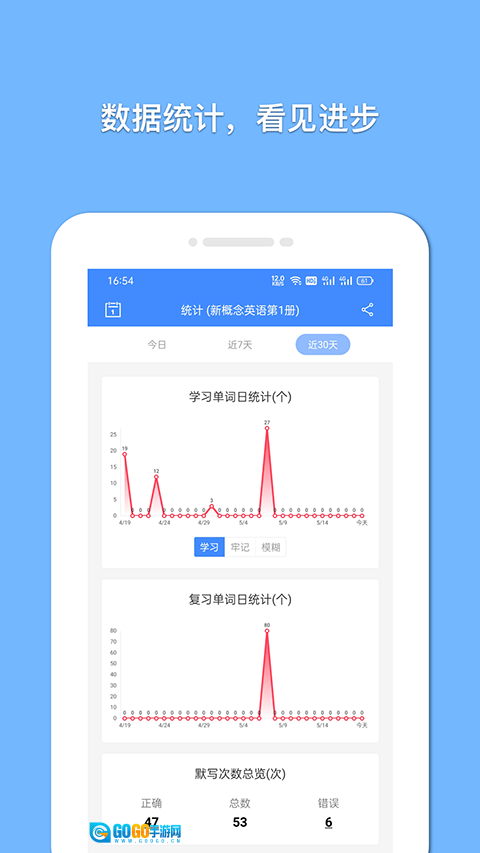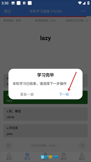 4、当完成本轮单词学习,页面会弹出“学习完毕”的提示框,点击“下一轮”,就能开启新一轮学习。
