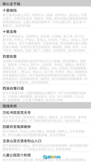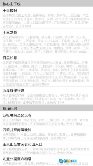 3、为大家分类推荐了不同难度的路线,涵盖纯休闲徒步线路、短距离经典路线、精心挑选的野路,还有各类正规比赛路线,助你更深入地了解杭州,进而爱上这座城市。