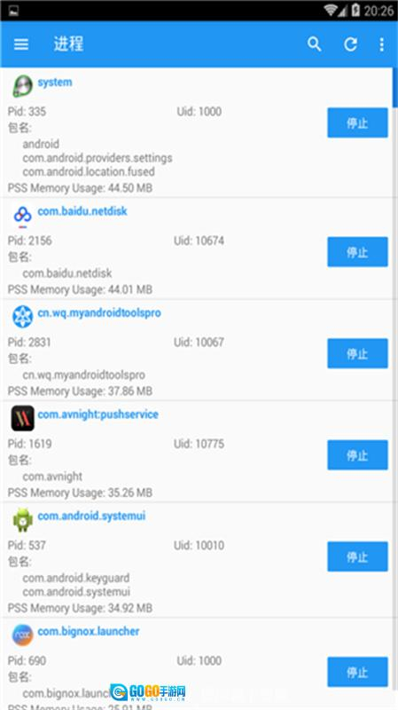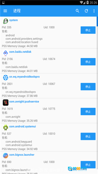 2、用户能够在线查看正在运行的进程,借此随时了解进程状态,并且随时终结手机中不必要的内存。