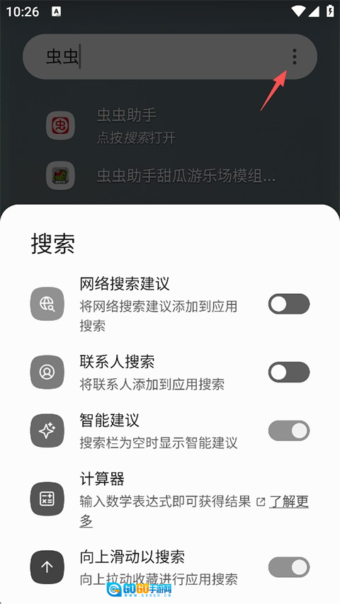 3、向上滑动屏幕打开搜索栏,若应用不在桌面或者属于不常用类型,可通过搜索的方式来查找。