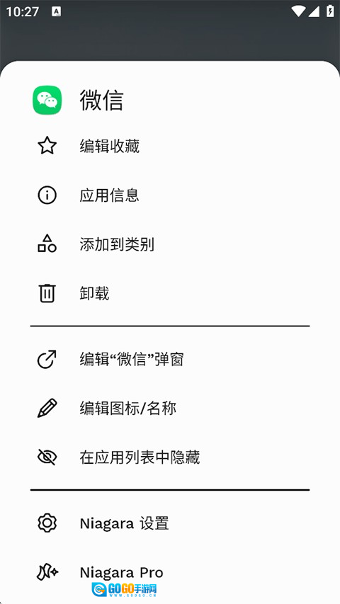 5、长按某个应用,弹出的对话框中,可快速进行查看应用信息、编辑图标名称、弹窗以及卸载等快捷操作,然后点击下方的【Niagara设置】功能。