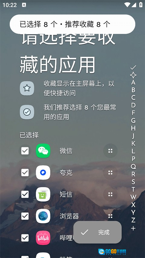 1. 开启Niagara Launcher Pro,挑选8个最为常用的App,并将它们在桌面收藏显示,随后点击右下角的【完成】。