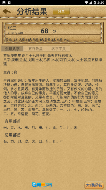 3、随后便能看到分析结果以及分数,在此还能免费查看生辰八字、五行数理与名字字义等内容。