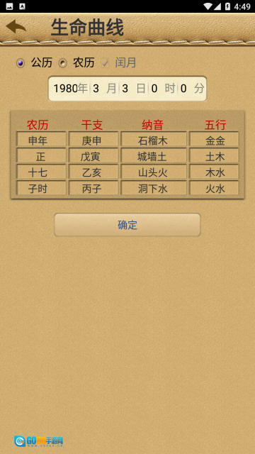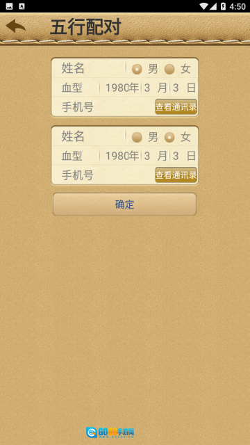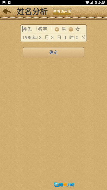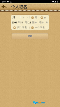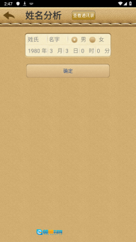 2. 进入姓名分析板块,依次输入姓氏、名字以及生日,选择对应的性别后,点击确定按钮。