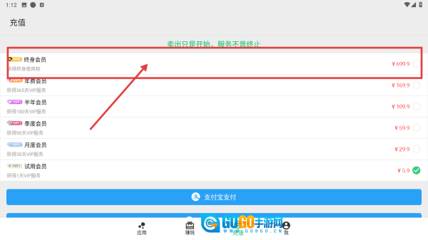2、进入充值界面,挑选终身会员等套餐,点击相应选项,使用支付宝完成支付以开通服务。