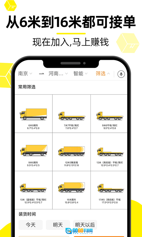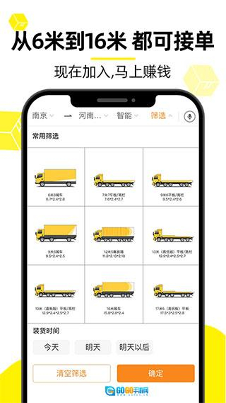 2、货车司机无需担忧车辆长短,6米至16米的车型都能接单,即刻加入,马上开启赚钱之旅。