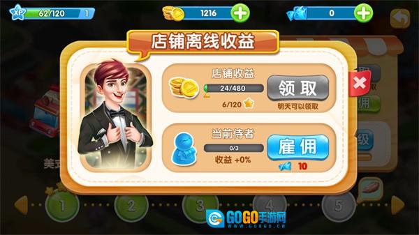 当我们把厨房的设备、材料以及装饰都升级完善后,却发现收益没有增长,很有可能是因为人手不足,致使出餐效率低下。此时,你只需依据店铺的经营状况雇佣适量人手。雇佣一名侍者需花费20个钻石,要是钻石不够,通过继续闯关升级、每日签到奖励或者去商城购买就能获取。虽然雇佣人手会使经营成本提高,但能让我们的收益增加10% 。