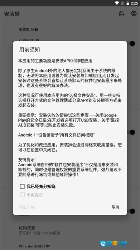【小黑屋】或【冰箱】需工作在设备管理员模式;安卓8.0及以上。6、安装狮 - shizuku 的使用条件如下:【shizuku】服务需正常运行,且设备系统为 android 6.0 及以上版本。