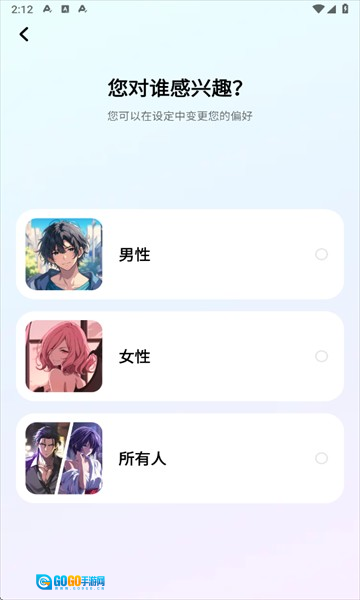 6、登录之后,你能够挑选自己感兴趣的角色性别,而且在设置里可以随时更改偏好,以此匹配用户的情感需求。