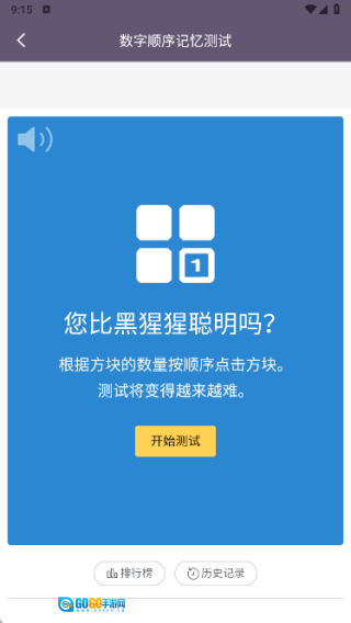 2、在数字顺序记忆测试页面,用户可轻松开启测试,同时还能查看排行榜信息。