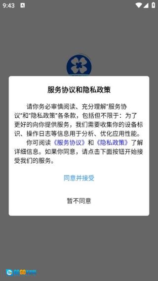 1. 安装软件完毕后打开,会弹出服务协议与隐私政策,点击同意并接受。