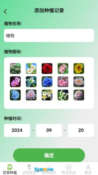 2. 进入种植记录添加界面,在此界面输入植物名称、选择植物图标,并填写种植日期即可。