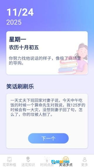 花草多点,是一款功能全面的手机软件。它融合了花草种植管理、送花知识科普以及趣味工具等多种功能,专为喜爱花草的人士和有送花需求的用户精心打造。该软件提供全方位的花草相关服务,不仅能够记录植物生长的整个过程,还包含大量专业的养护知识以及花语搭配技巧。此外,软件还融入了趣味时间计算器和笑话资源。