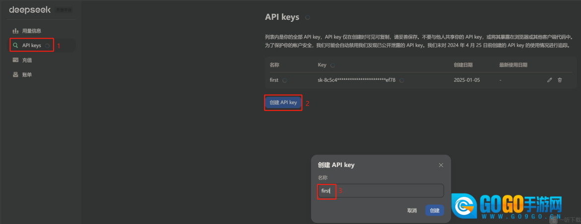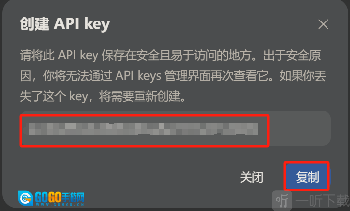 请注意:成功创建 key 后,请立即进行复制并做好记录。一旦错过此时机,将无法再次查看该 key,只能重新创建。