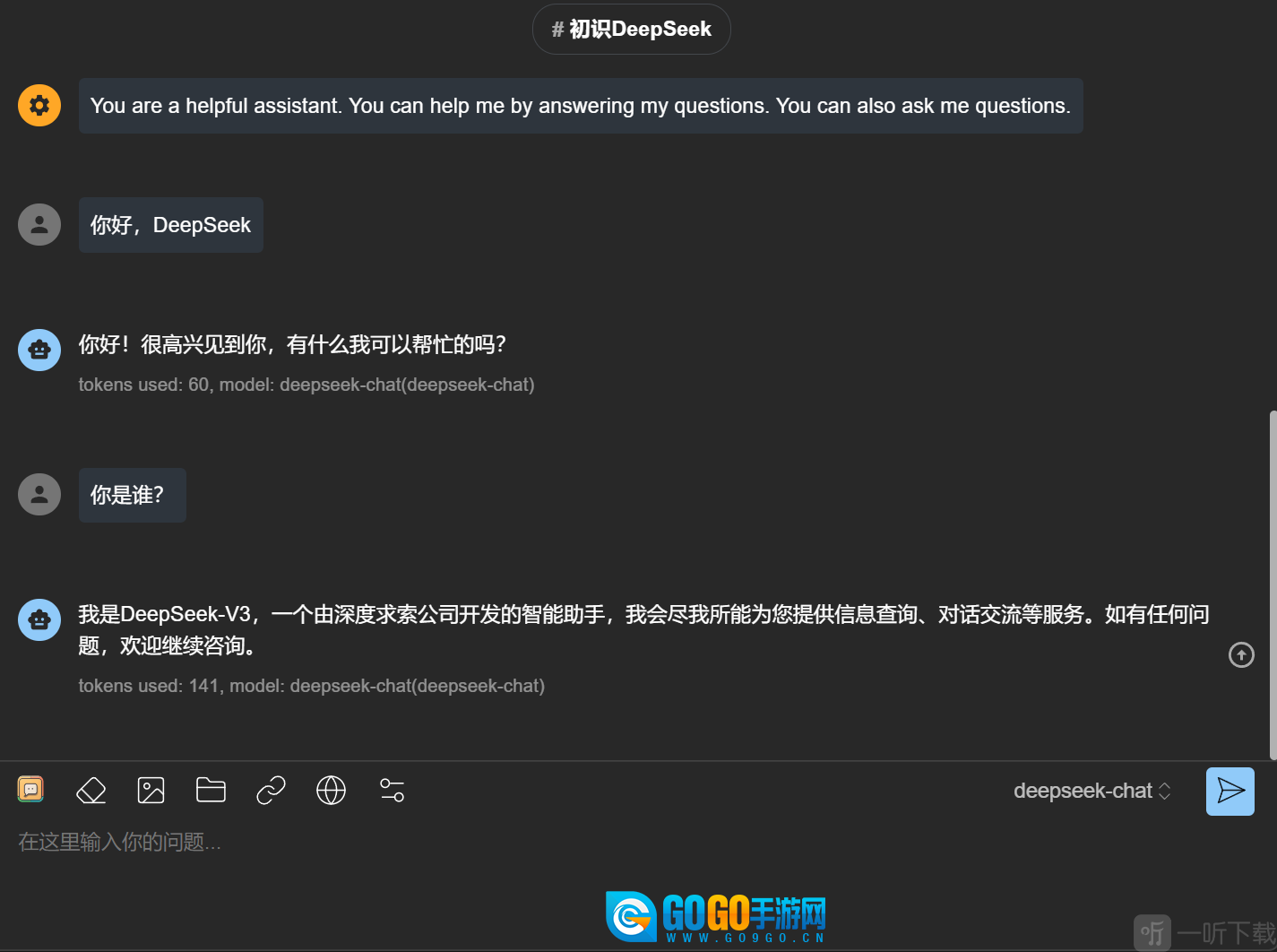 在Chatbox里输入测试问题,例如“你好,DeepSeek”。
