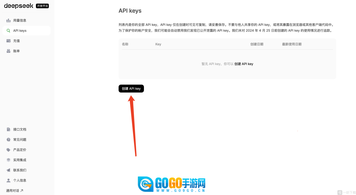 3、完成登录操作后,找到页面左侧的API Keys页面并进入,然后点击“创建 API Key”按钮。