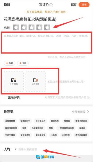 3、进入之后,即可对店铺进行打分、填写评价、上传图片,还能选择评价是否匿名。