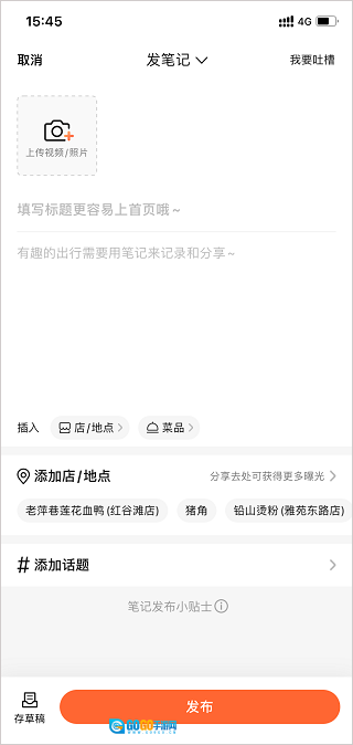 1. 首先在首界面轻点“+”,随后于发笔记的对应位置,上传视频或照片,同时填写标题与内容,还要插入店铺位置以及相关服务或菜品信息。