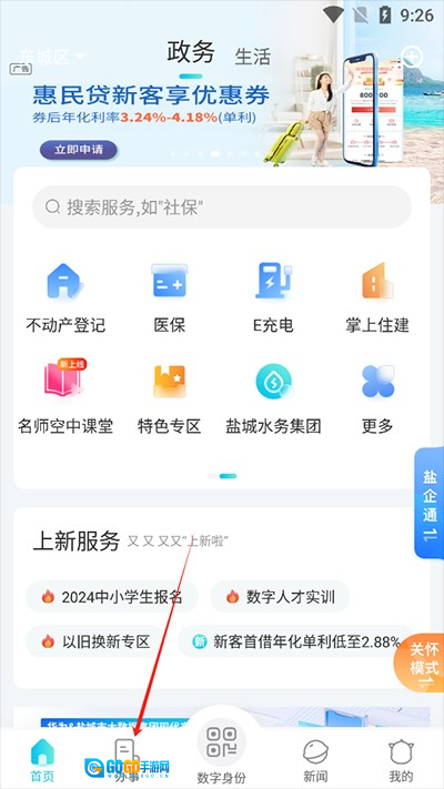 1、打开“我的盐城”软件,完成注册登录后,点击“办事”选项。