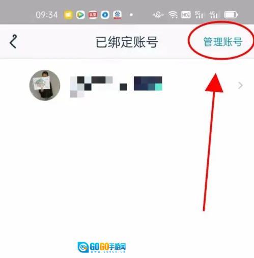 4、跳转至已绑定页面,点击右上角的“管理账号”,如下图所示。