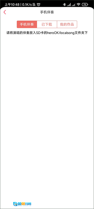 3、此时我们尚未将伴奏上传至软件中,进入手机伴奏界面后,能看到提示,要求我们把文件放入指定文件夹,这时前往手机的文件管理进行移动操作即可。