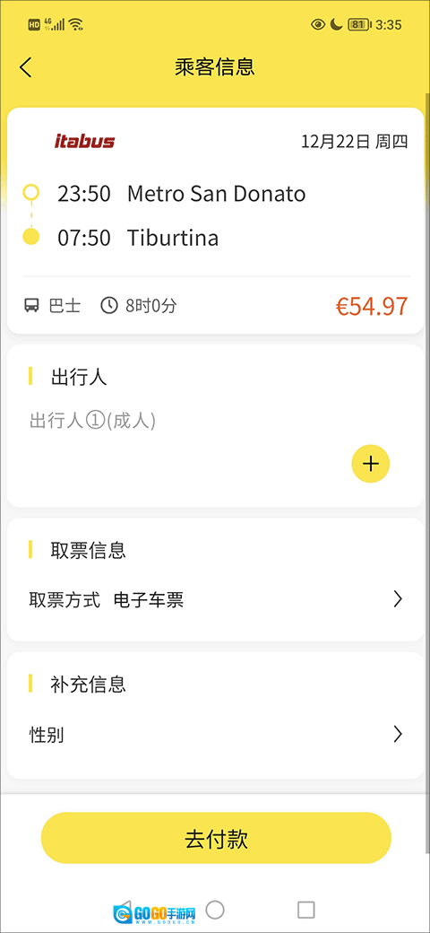 4、最后,在此处仔细确认乘客信息,填好出行人、选定取票方式、补充相关信息后,即可点击去付款。