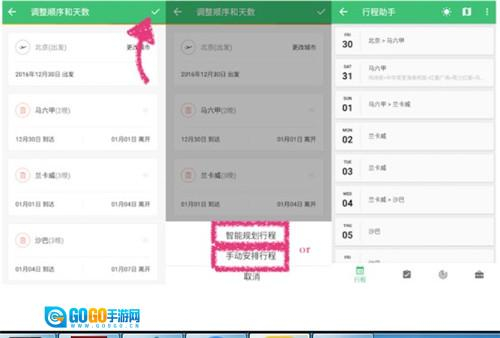 3、对出行天数与顺序进行调整,可通过智能或手动方式规划行程。