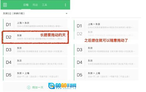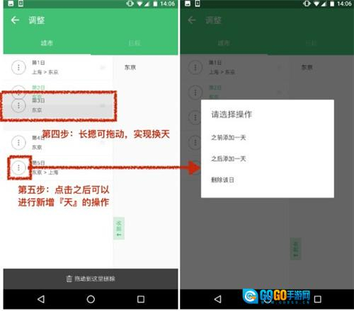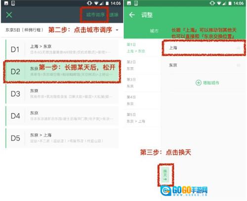 2、若要插入某一天的行程,长按即可进入编辑状态,同时上方会出现“城市调序”。