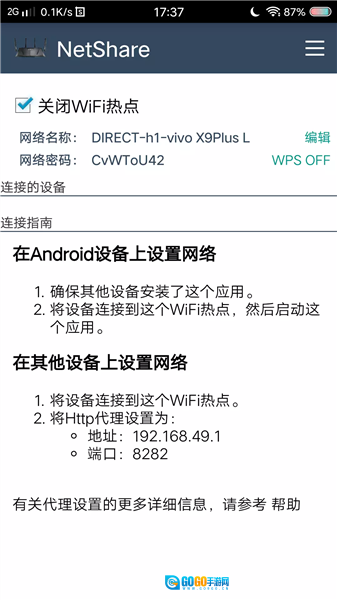 4、代理设置成功后,客户端设备即可通过您的手机成功接入互联网,实现网络共享。
