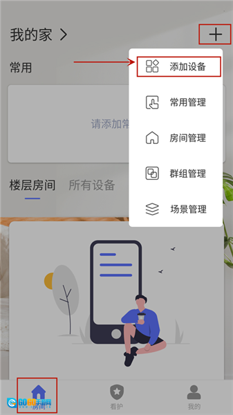 1在本平台完成软件安装后,初次打开该应用时,需通过手机号或电子邮箱完成账号注册与登录操作。登录成功后,系统将自动跳转至应用的“房间”界面,此时点击界面右上角的加号图标,在弹出的选项中选择“添加设备”即可。