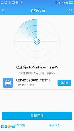3.确保电视和手机连接的是同一个WIFI网络,打开易互动康佳手机端应用,它会自动扫描附近可连接的设备,完成手机与电视的连接后,就能用手机来操控电视了。