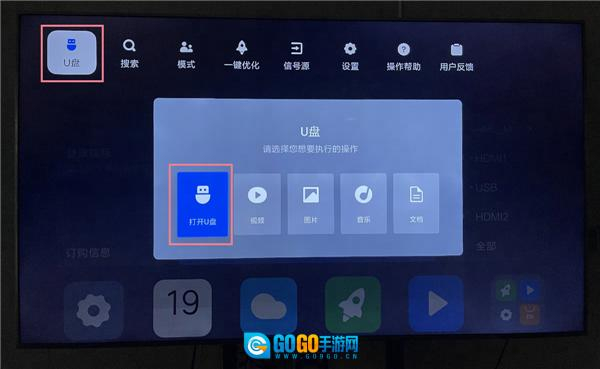 2、将U盘插到电视上,在弹窗上选择“打开U盘”,如果未弹出,可在电视首页最顶部,按“上”键,找到U盘。