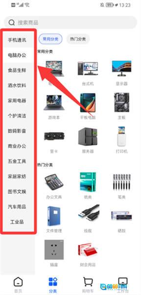 1、在分类页面选择商业办公大类,进入办公文具分类。