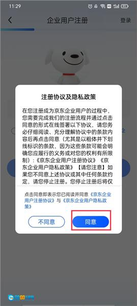 2、页面弹出了京东企业购相关的注册协议及隐私政策,点击“同意”按钮。