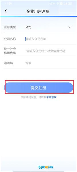 6、选择注册类型,输入公司名称、统一社会信用代码,选填邀请码,点击提交注册。