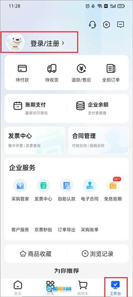 1、进入京东企业购App【首页】之后切换到【工作台】,点击上方的“登录/注册”。