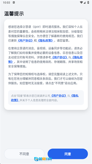1、企慧语安装完成后,打开软件会弹出温馨提示的窗口,直接点击同意即可。