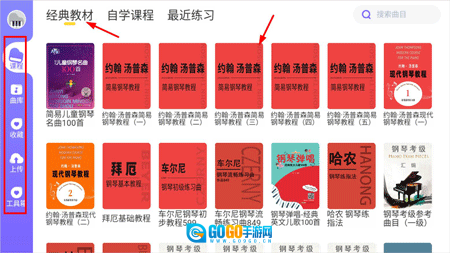 1、启动钢琴智能陪练应用,界面左侧展示着软件的基础功能模块,点击上方的选项即可进入经典教材的选择页面。