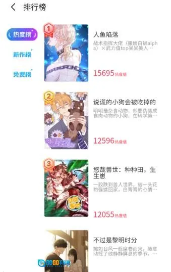 2、在排行榜中可以了解热度榜、新作榜以及免费榜等信息,了解不同的榜单更方便
