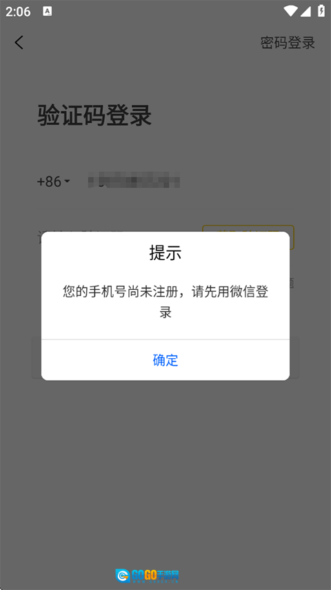 2、若使用下方手机号登录且之前没有注册过,系统还是会提示使用微信登录注册。