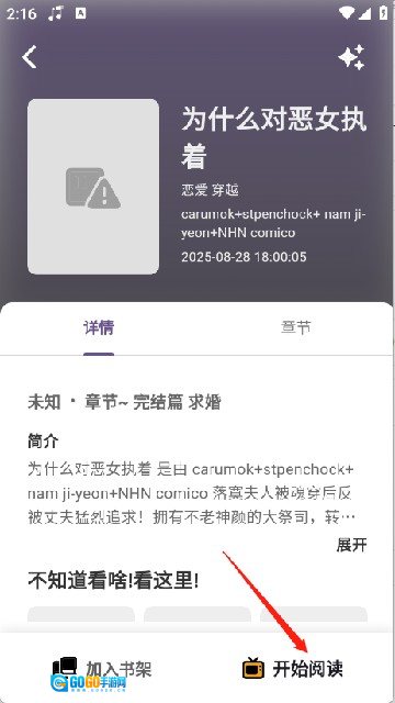 5、点击心仪的漫画进入详情页,查看简介、章节列表与用户评价,确认后点击【开始阅读】按钮。
