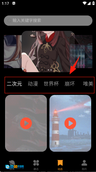 2、在动态壁纸中,根据中间的栏目分类来找寻你喜爱的壁纸。