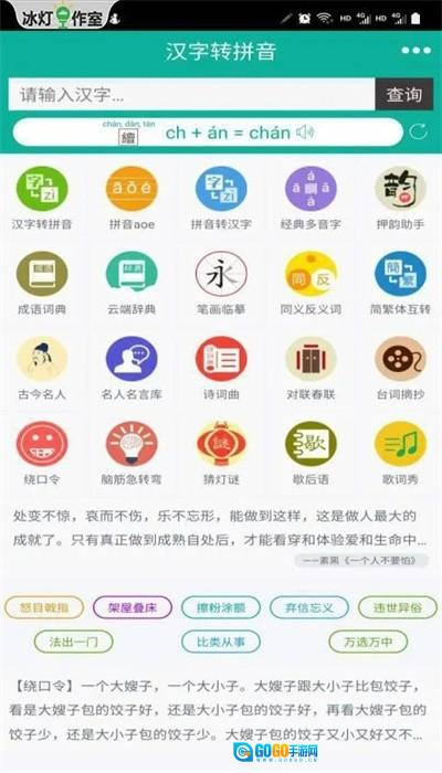 汉字转拼音是一款集汉语发音、字典辞典、成语词典、诗词曲赋文、绕口令等功能于一体的普通话学习助手,属于学习常用工具软件。它能帮助您远离生僻字、学好标准普通话,还提供汉字笔画顺序动画分解及字帖描红练习书写功能。该软件支持汉字转拼音(含声调显示),可准确还原标准发音;同时涵盖汉语字典、成语词典、诗词曲赋等多类权威内容,查询便捷、结果清晰,适用于学习、教学与语言研究等多种场景。
