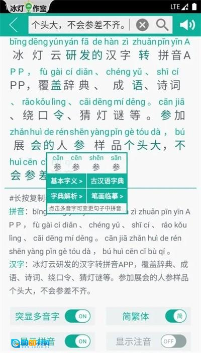 1、智能注音功能:无论是输入单个汉字还是完整句子,只需一键操作,即可生成带有声调的标准拼音,并且能够智能识别多音字。