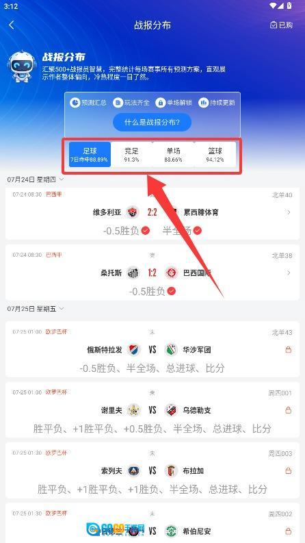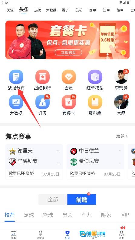 3、进入首页后,您可以浏览各类体育赛事的相关信息,点击战报分布查询功能,即可进入赛事数据页面。